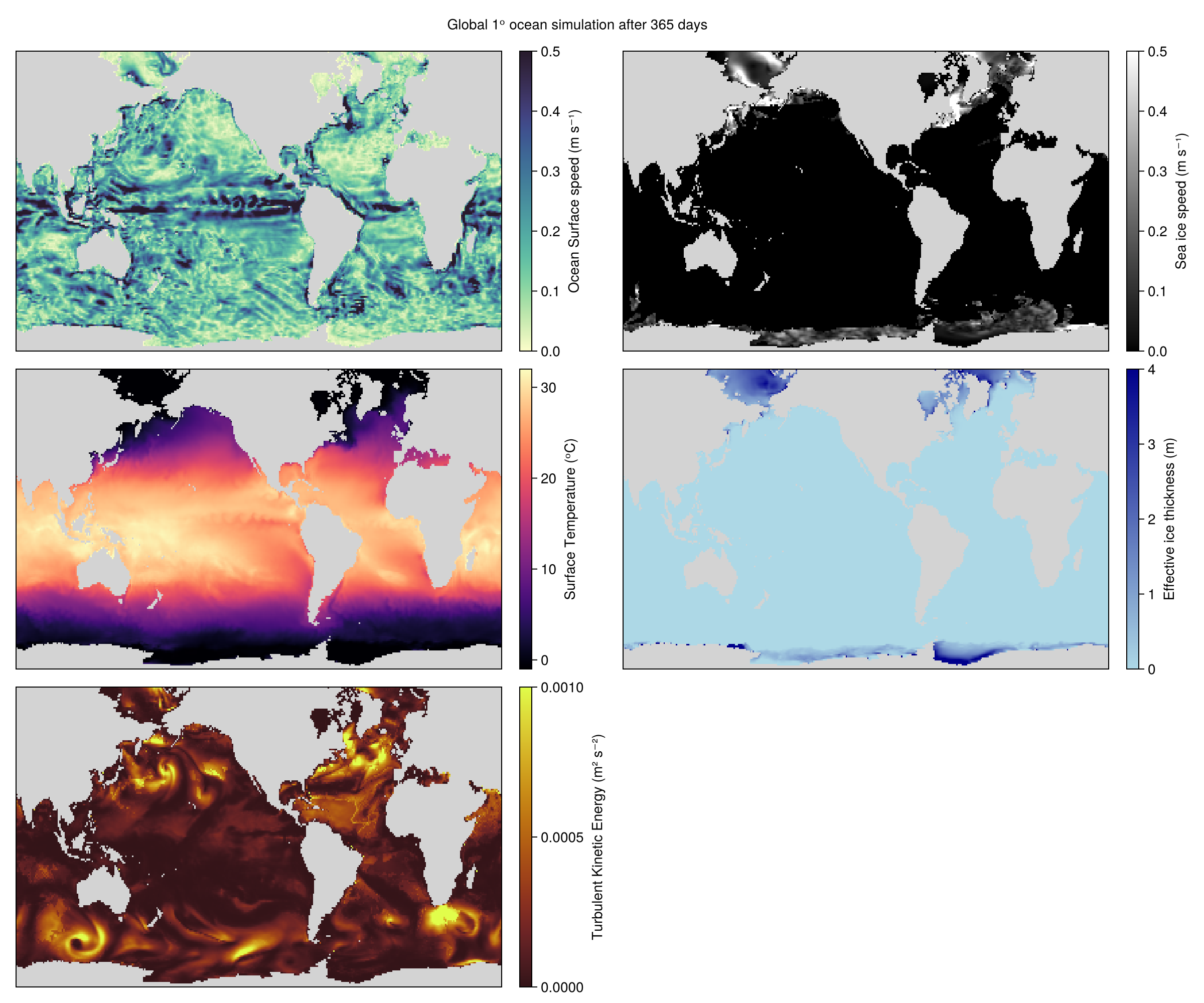 This example configures a global ocean–sea ice simulation at 1ᵒ horizontal resolution with realistic bathymetry and a few closures including the "Gent-McWilliams" IsopycnalSkewSymmetricDiffusivity. The simulation is forced by repeat-year JRA55 atmospheric reanalysis and initialized by temperature, salinity, sea ice concentration, and sea ice thickness from the ECCO state estimate.